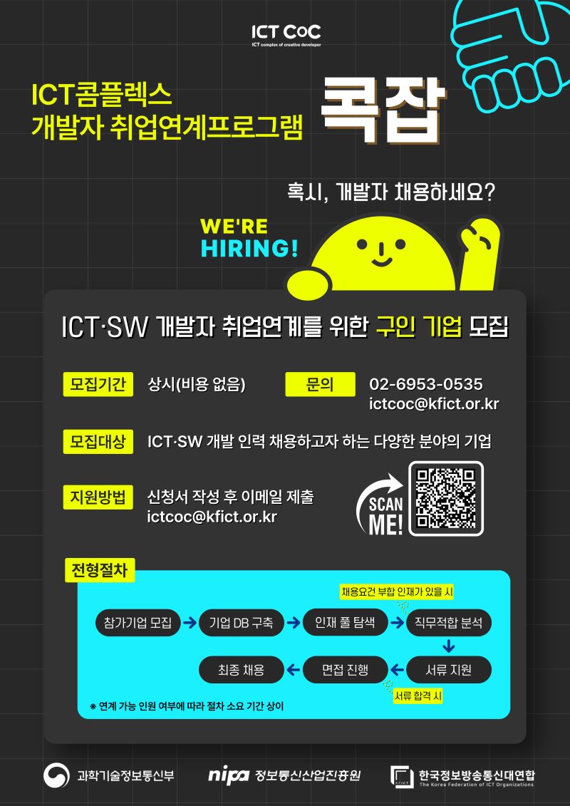 ICT콤플렉스에서는 ICT·SW 개발자 취업 연계를 위한 채용 계획 중인 구인 기업을 "2026년 상시 모집"합니다. 개발 인력 채용을 계획하고 있다면, 많은 신청 부탁드립니다.