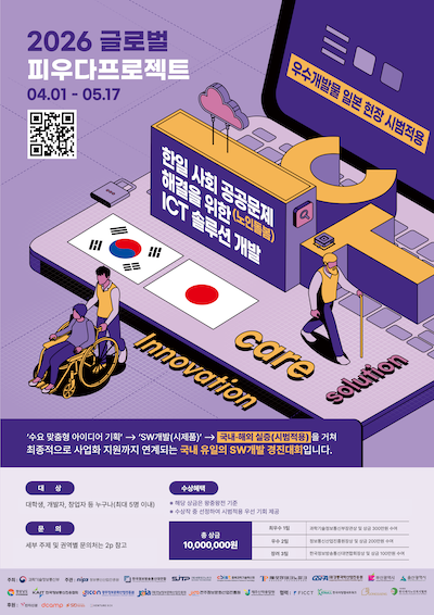 수도권 | 🌍[글로벌 피우다프로젝트] 2026년 제16회 SW개발 공모전(한일 노인돌봄 해결을 위한 ICT솔루션 개발) 참가자 모집(~5.17.(일))🌍 2026-04-01 -